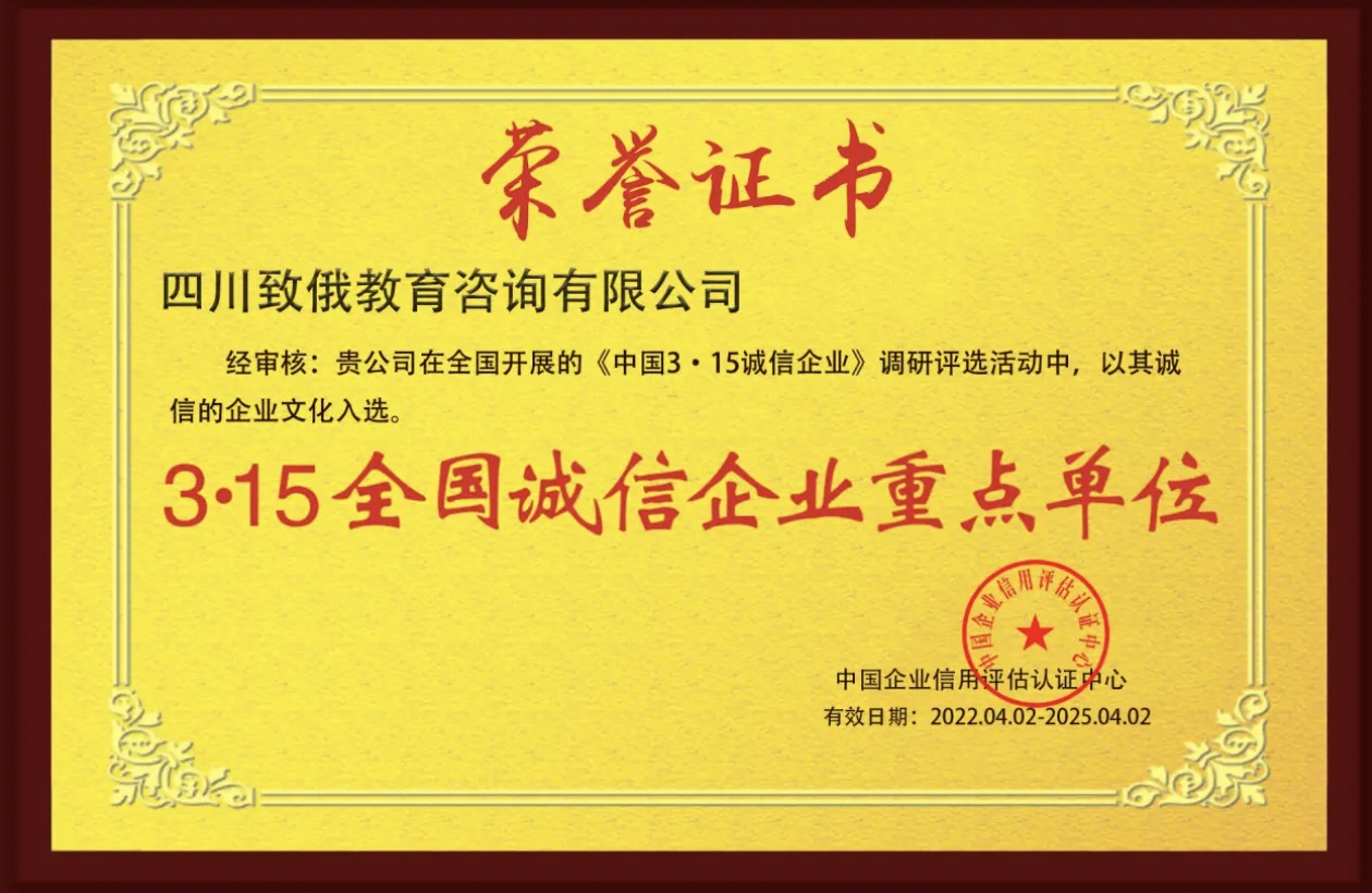 四川致俄教育咨询有限公司,获得 3.15 全国诚信企业重点单位荣誉证书 ZINORUSS has been awarded the 'National Integrity Enterprise Key Unit Honor Certificate on 3.15